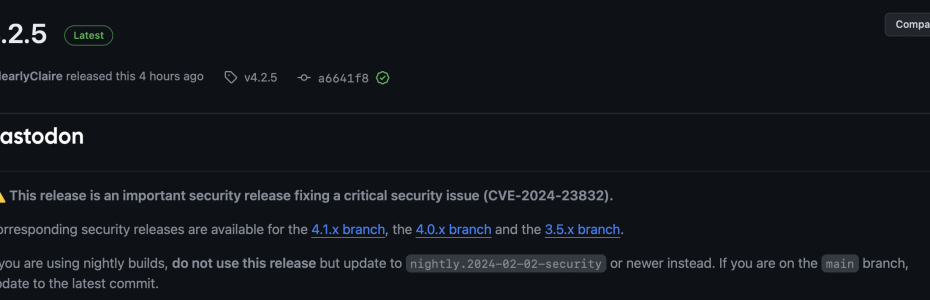 Recently the new #Mastodon v4.2.5 was announced and with it the urge of a security fix. In a previous article I explained a strategy to keep the code customised and up to date, and even working with #git is part of my daily work, I feel like explaining in detail the process so that I will remember it for future references and also may help anybody that has the instance somewhat customised.