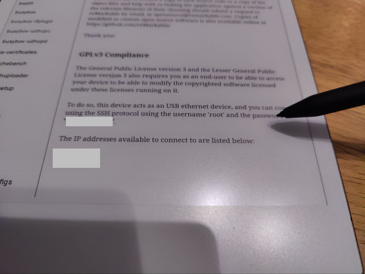 Your Remarkable has SSH enabled. You only need to get your credentials and log in. Still, there are a couple of extras we can do to easy our life in all this process, like changing to a key authentication access and remembering the device by a name and not by IP. They are optional steps but still explained here.